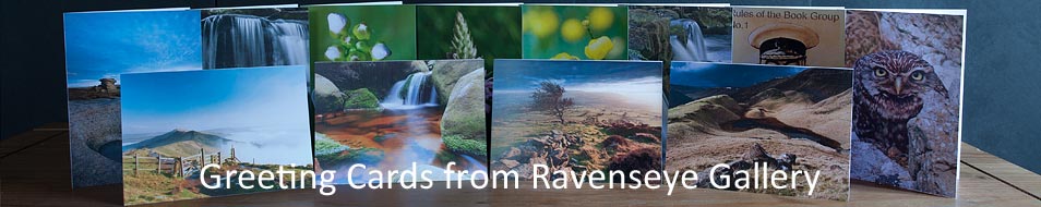 Single cards are posted in an A5 envelope, along with a piece of card to protect them in transit. Packs of Six cards are posted in a protective padded envelope, again with additional stiffening to protect them. We are always adding new designs, so please come back and visit regularly Bespoke DesignsIf you would like some of our cards made up for specific purposes then we can easily enhance a design with your own specification of text, on either the front or the inside or both. Adding text to the front of the card adds an additional 44p to the card price while adding text to the inside of the card adds 30p. A single bespoke card with text added to both the front face and inside face therefore costs £3.14, however discounts are available for bulk purchases of bespoke designs. Simply call us on 01298 871958 if you would like to discuss your requirements in detail.ResellingGreeting Cards from Ravenseye Gallery are available in a number of outlets throughout the Peak District but we always welcome enquiries. We offer competitive discounts on bulk sales and a basic package of 5 copies each of 10 designs costs £54. Again, please call us on 01298 871958 if you are interested in taking this service.Ravenseye Gallery, 49, Middle Row, Cressbrook, Derbyshire SK17 8SX t: 01298 871958 e: chris@ravenseye.plus.com w: www.ravenseyegallery.co.uk Site last updated 8th October 2012 |